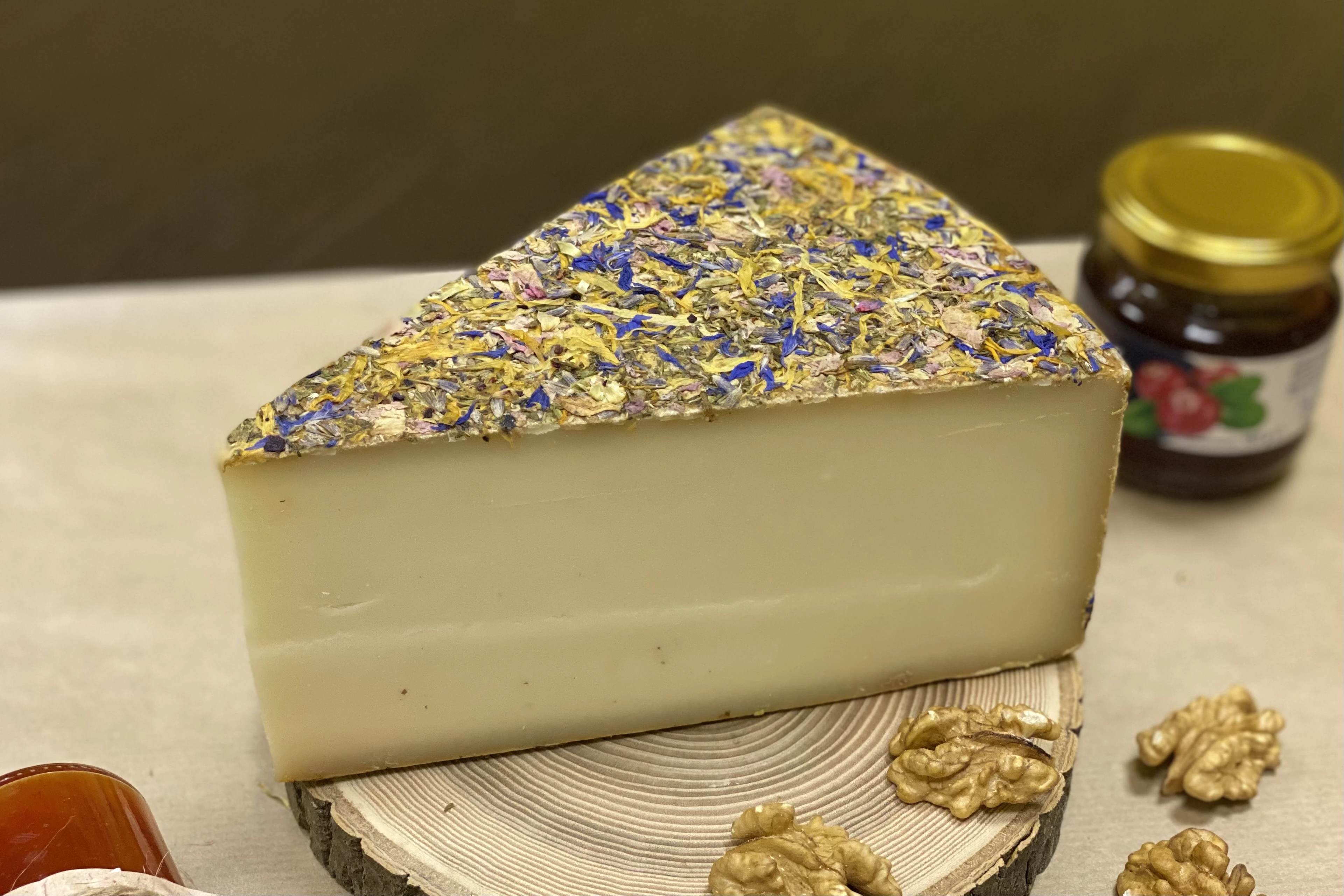 Именно так пахнет сыр «Летний луг»! Его корочка утопает в лепестках роз, васильков и календулы, а тело таит в себе аромат цветов и сушеных фруктов.