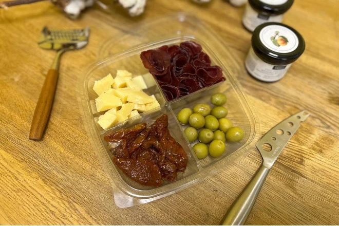 Тарелка из 4 видов мясных деликатесов и оливок, упакованная в менажницу с крышкой