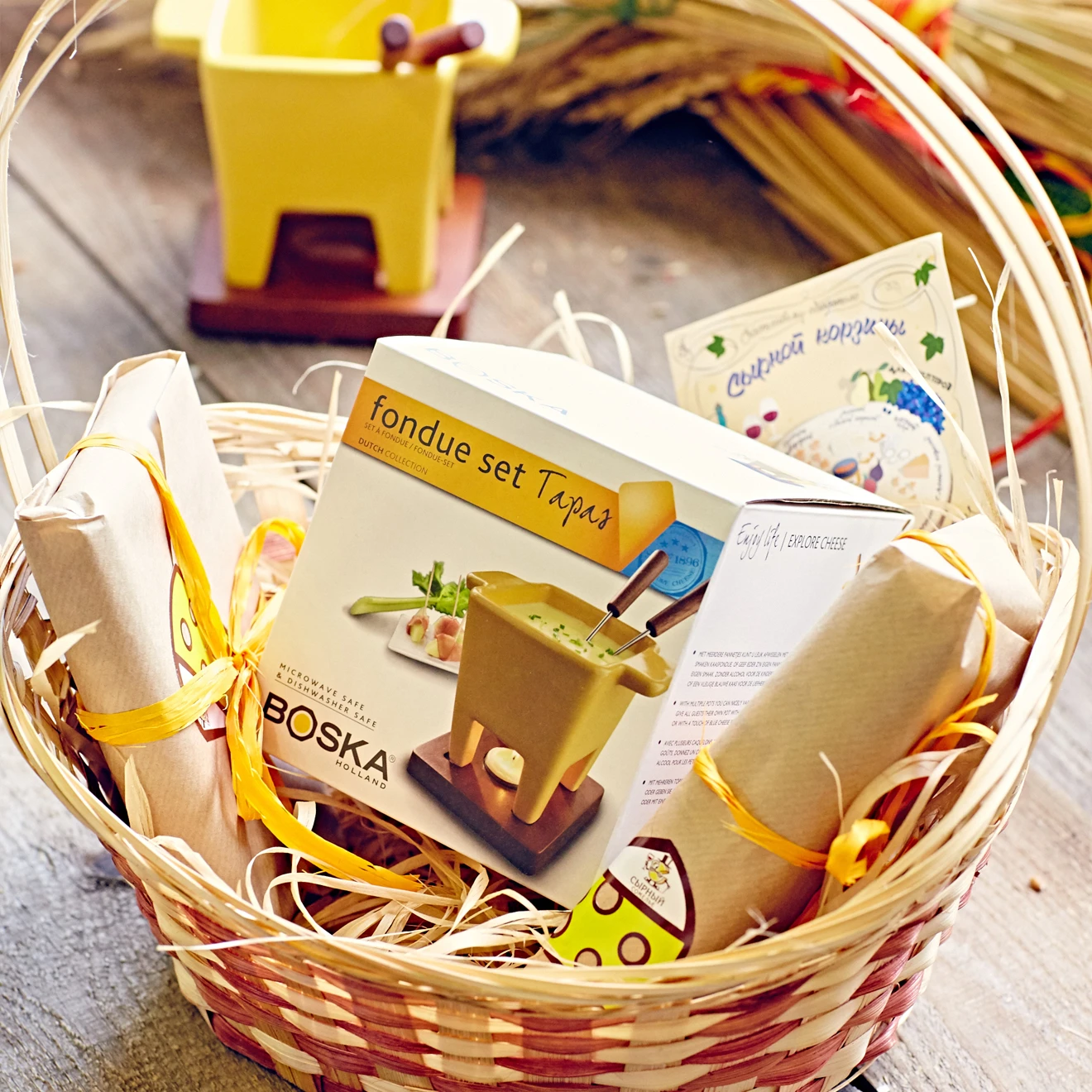Подарочный набор с двумя видами сыров и теркой для сыра, упакованные в маленькую плетеную ... еще