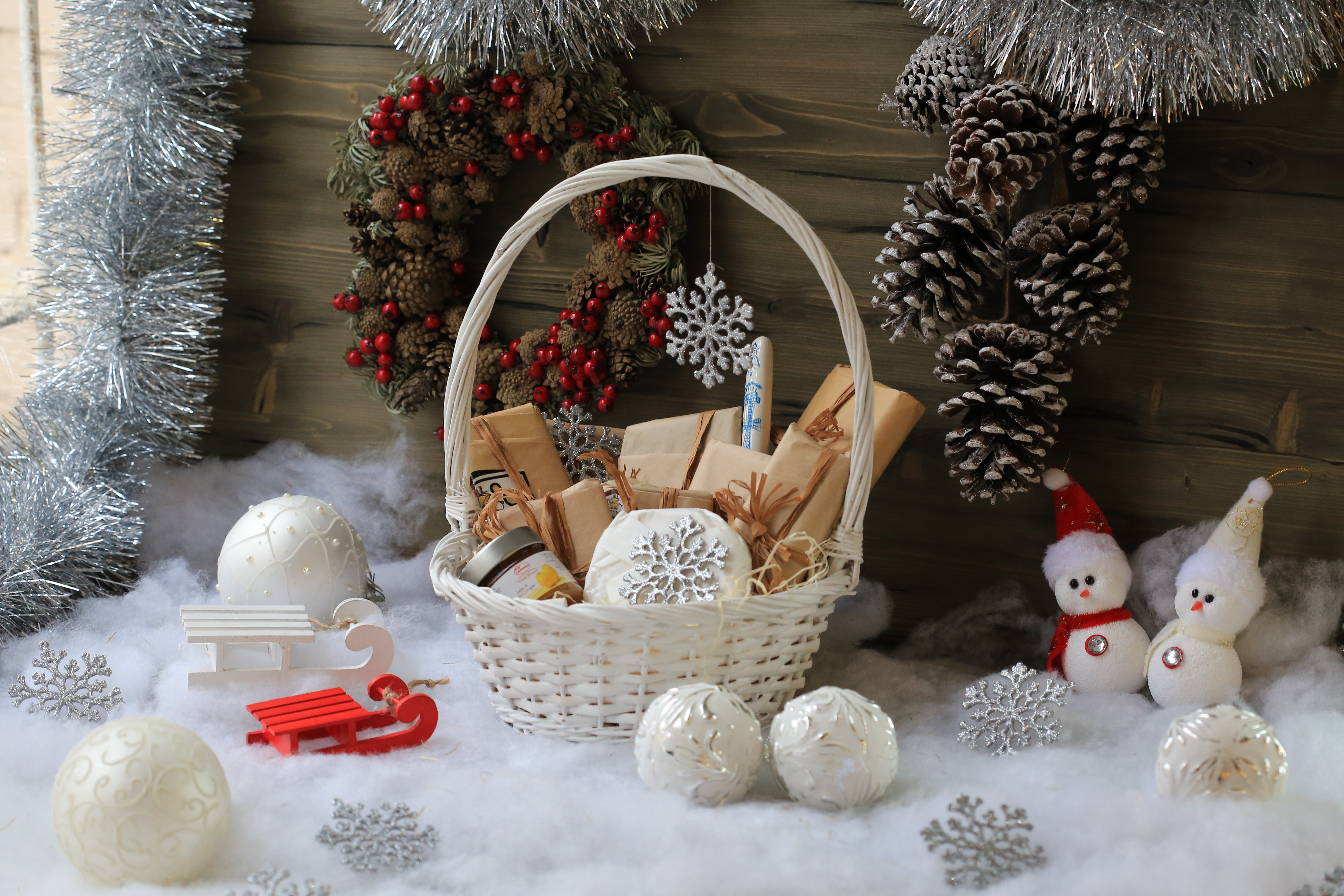 Подарочный гастрономический набор, упакованный в крафтовую коробку и новогодние украшения