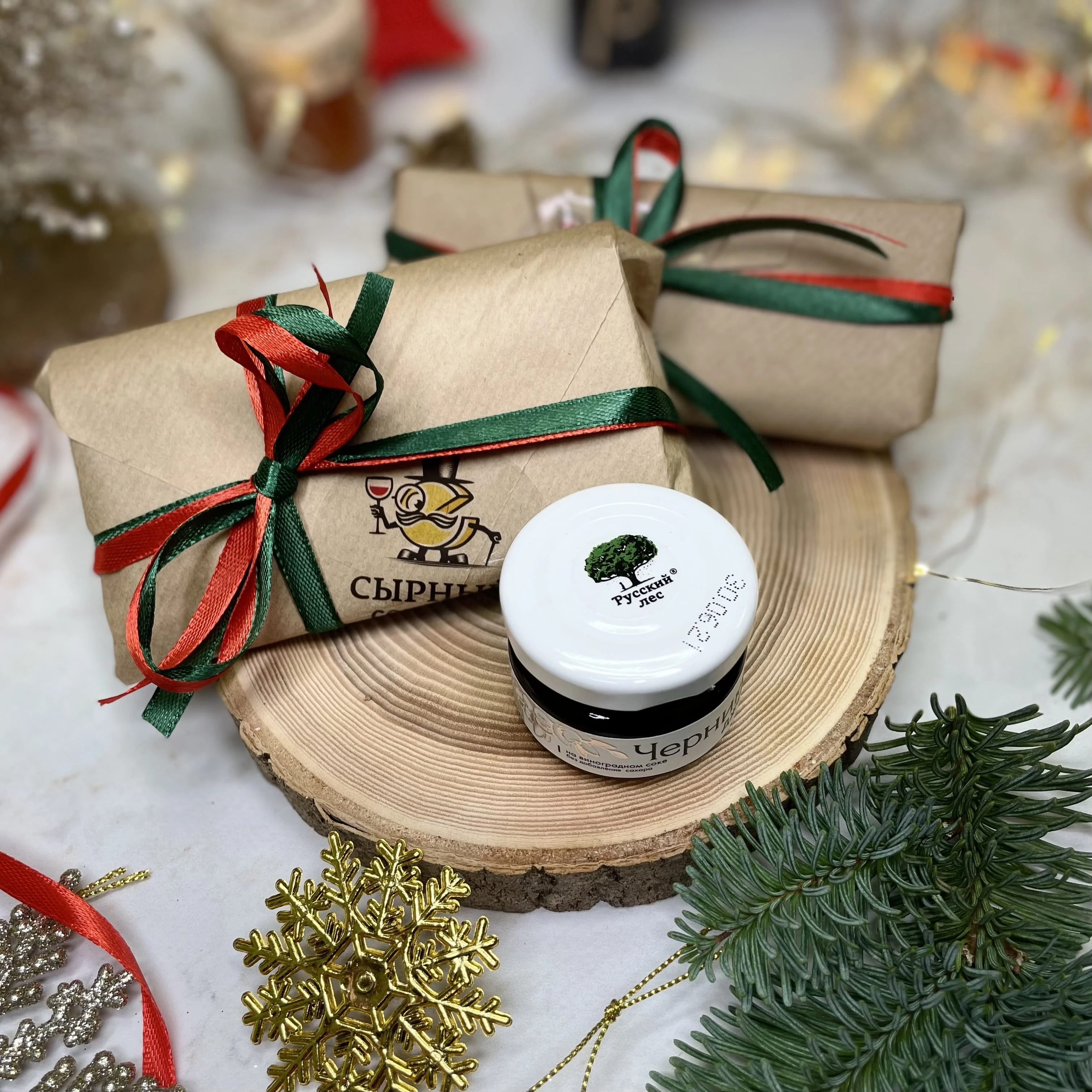 Подарочный гастрономический набор, упакованный в крафтовую коробку и новогодние украшения