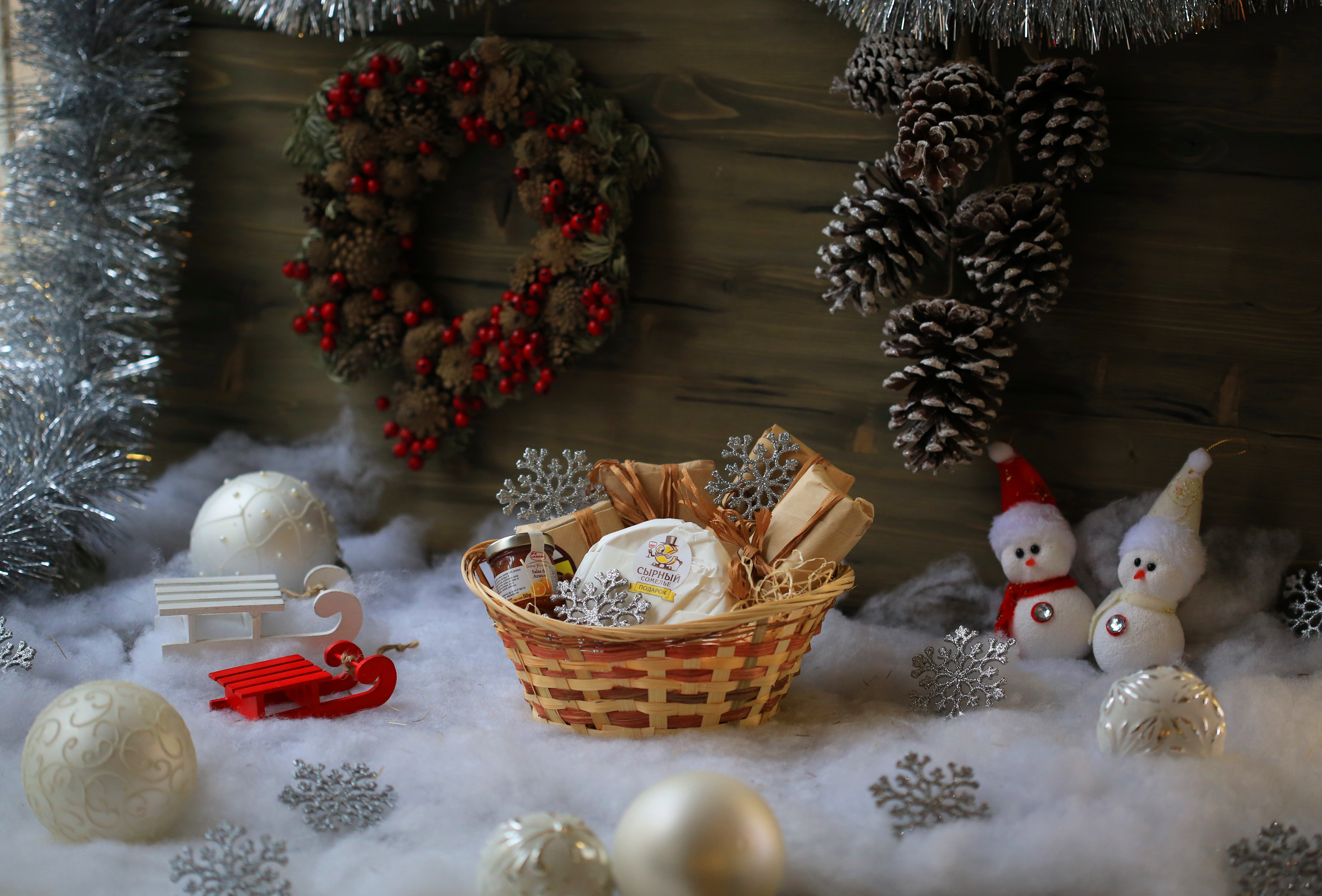 Подарочная корзина с пятью видами сыров и итальянским соусом.