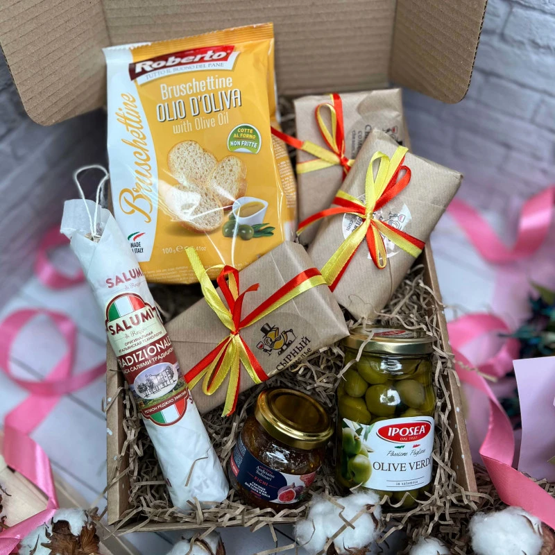 Подарочный гастрономический набор, упакованный в крафтовую коробку.